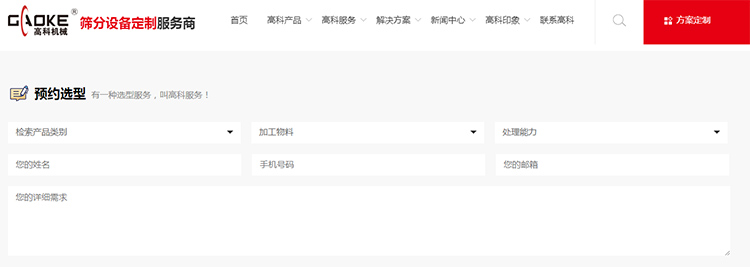 利用互聯(lián)網(wǎng)平臺,高科機械還推出在線預約選型服務(wù),您只需要打開高科機械官網(wǎng),在高科服務(wù)一欄中找到預約選型服務(wù),即可在線填寫設(shè)備使用的產(chǎn)品類別、加工物料種類及處理能力等信息,留下聯(lián)系方式后,我們的工作人員會在兩個工作日內(nèi)回復,為您提供科學合理的選型方案。